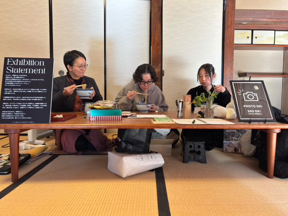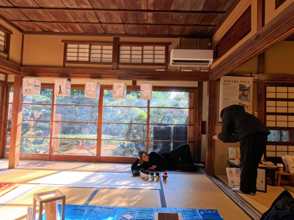 今回の個展「だいたい四〇〇年くらい布団の上」も冬の畳の上で開催した。2025年に開宿400年をむかえた千住宿。会場である仲町の家は、千住仲町エリアにある戦前に建てられた日本家屋。千住のまちをつくった重要人物のひとりである石出掃部介吉胤のご子孫が大切に守ってこられたお家で、いまでは文化サロンとして、ご近所さんから文化活動をする多くの人にとっての「場」になっている。本屋しゃんもこの「場」にお世話になっているひとりで、「TRiPー落語×浮世絵ー」や「遅四グランプリ」を軸に活動中。