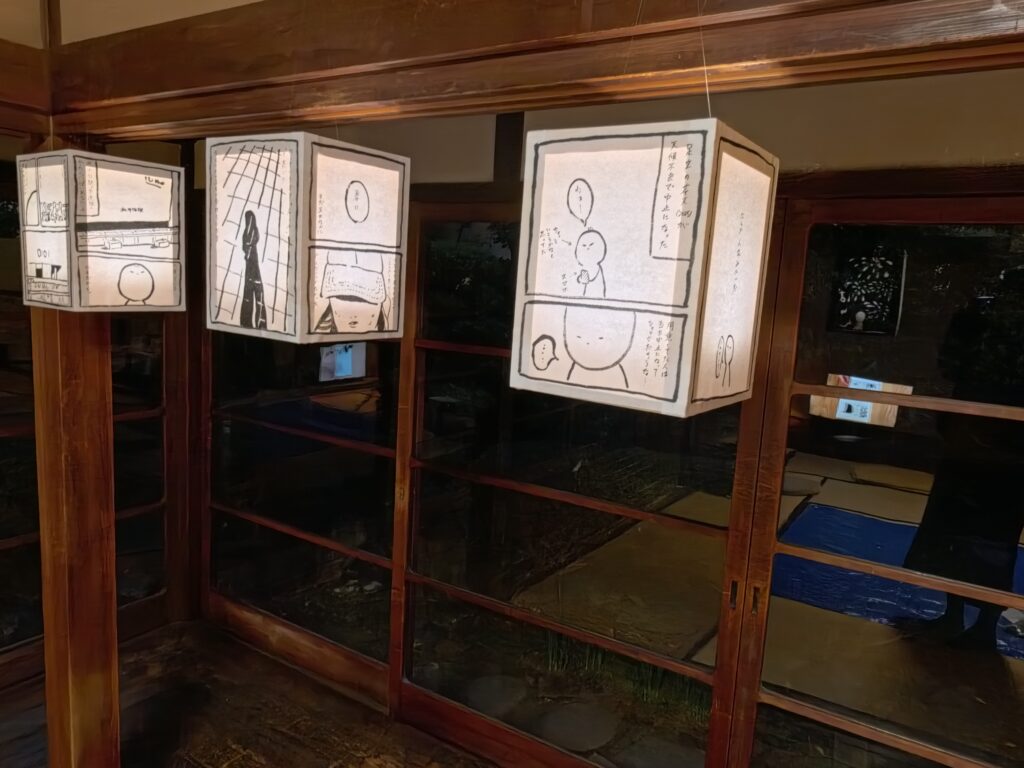 外が暗くなってきたころに漫画行灯にあかりを灯す。ほわ~っと内側から照らされる漫画はよりぼーっと感を醸してくる。