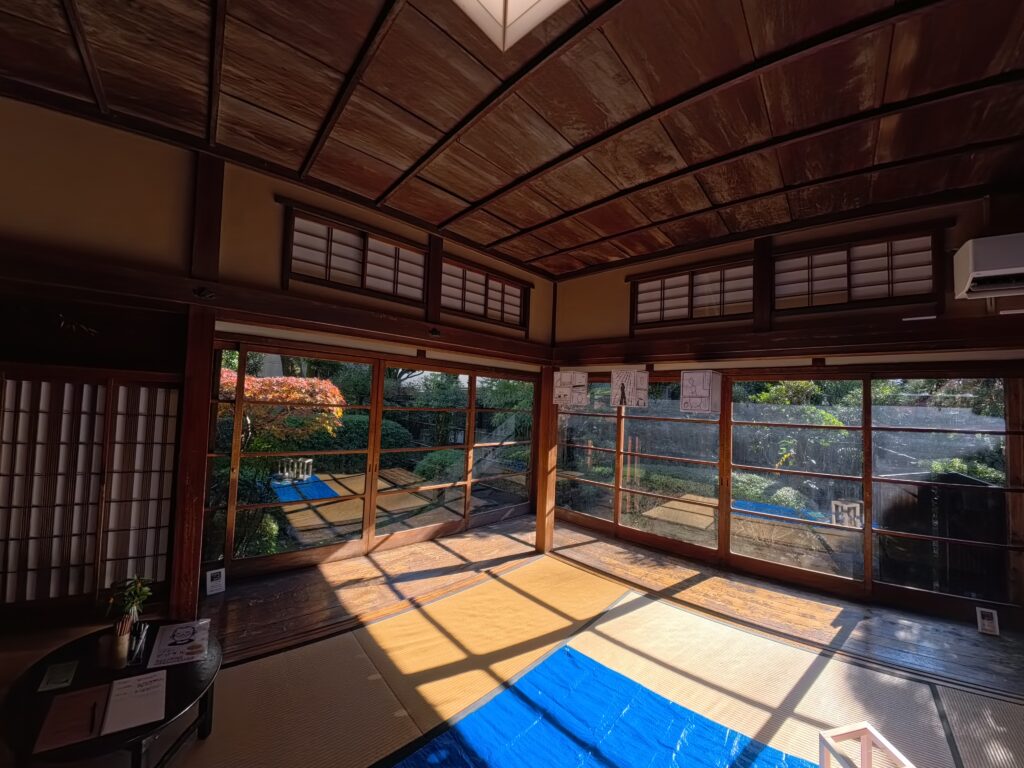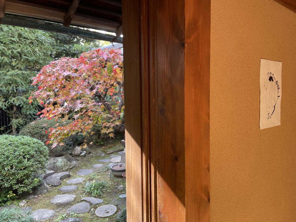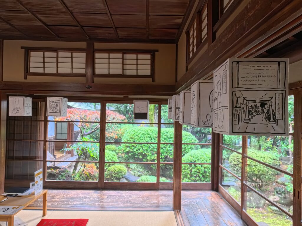 MIOKOのライフワークである『だいたい布団の上』シリーズの最新漫画の原画も展示をした。@ お茶室。このお部屋から見るお庭はそれはそれは美しくて紅葉がひっそりと彩を添え、雨の日は濡れる緑が艶やかで心落ち着く。