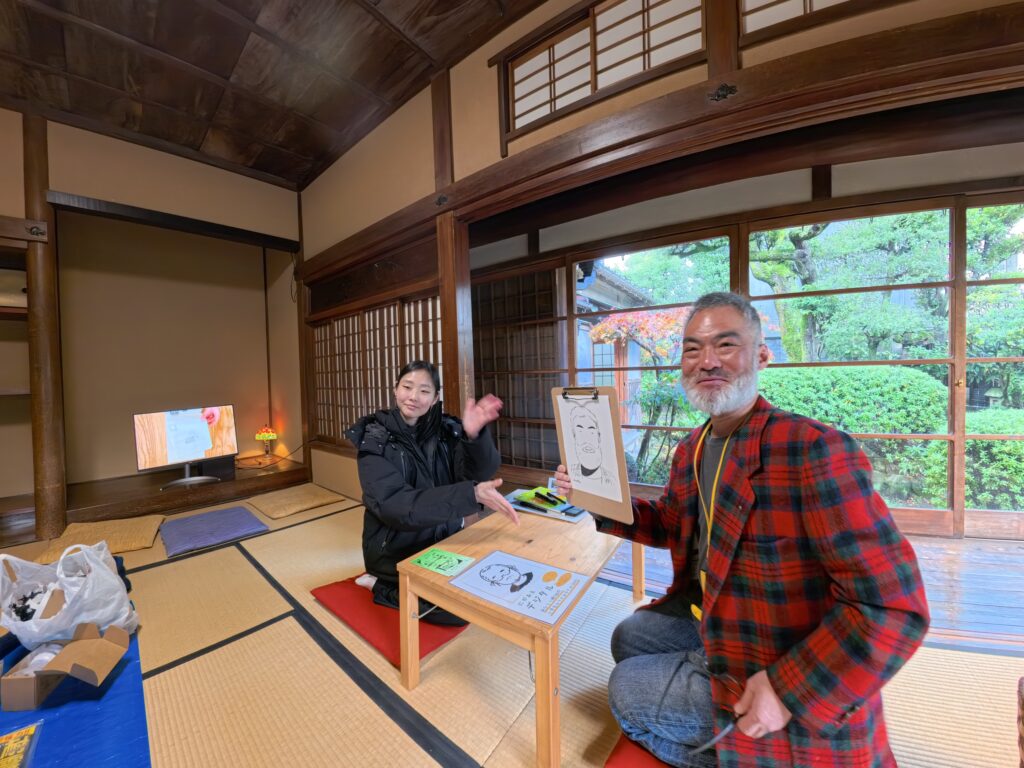 似顔絵やさんも開催した。2025年2月に根津の直会での個展「布団の虫干し」ではじめて開催した似顔絵やさん。以来人気企画。MIOKOのオリジナルキャラクターである「まめこ」風に仕立てる似顔絵だ。みんな「まめこ」になるのに似ている。ゆる似。