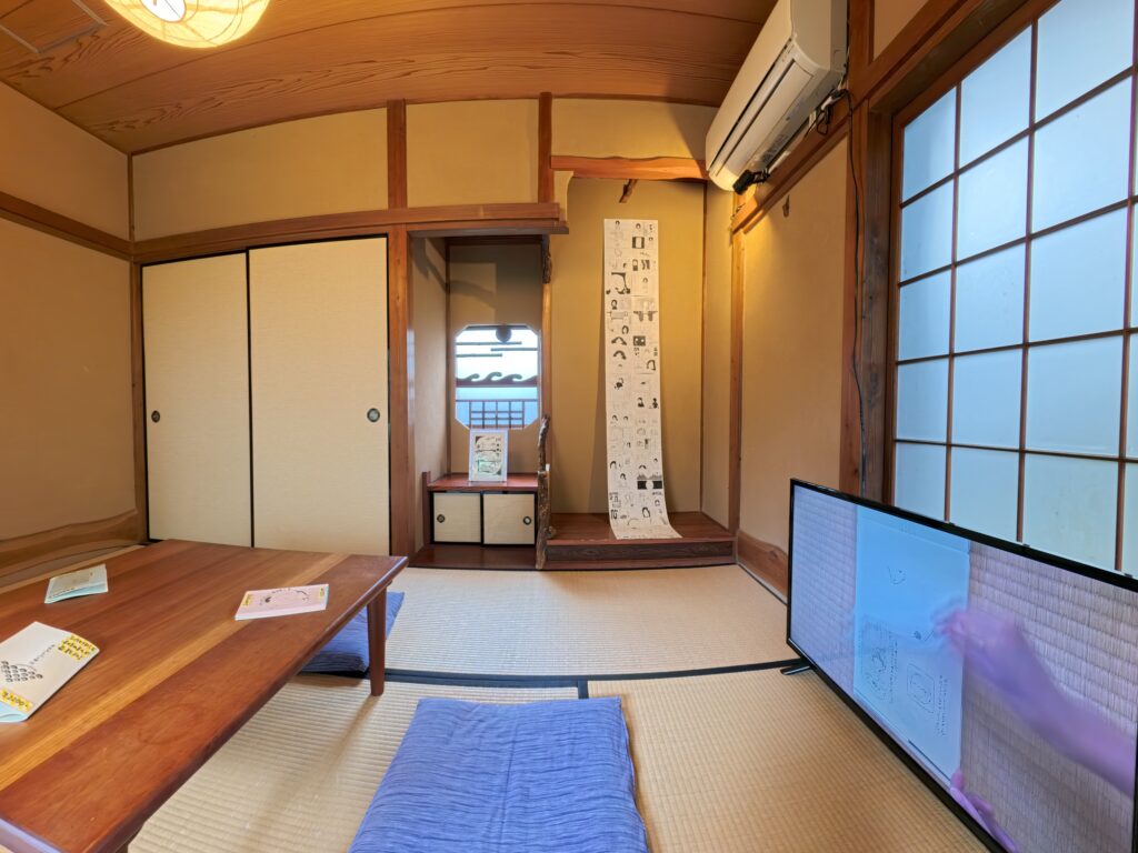 床の間に掛幅のように漫画原画を。その傍らに、「だいたい四〇〇年布団の上」の原画を。モニターにはMIOKOの落書き帳をパラパラ漫画風にした映像を。思い思いにお座布に座ってぼーっと映像を眺めたり、漫画を読むのに上下運動したり、お庭を愛でたり……それぞれの時間を自由に過ごしていただいている様子が嬉しかった。お散歩倶楽部のご一行は、テーブルを囲んで健康について語り合っていたな。近くの保育園のちびっこたちはちょこねんと座って、大人たちの心をかっさらっていたな。