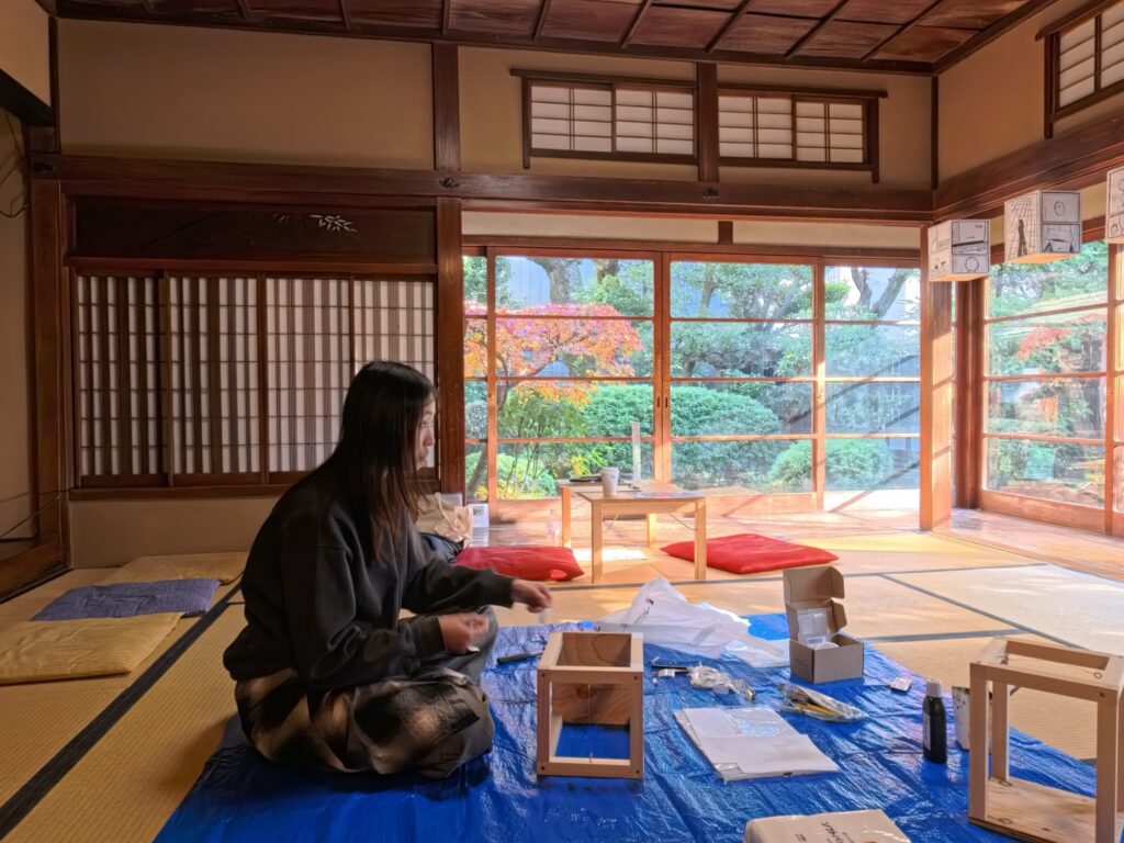 木枠に障子紙を貼って、そこに墨で千住を散歩して描いた漫画を描いていく。