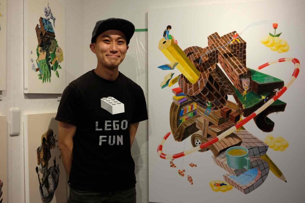 アクリル絵の具やiPadを使い、建物、動物、食べ物、植物…など、さまざまなものを融合させた不思議でユニークな空間を描く。子どもの頃、「字は汚いけど絵は上手いね」と言われたことがきっかけで、字の汚さをコンプレックスに感じつつも、「絵で世界で一番面白い字を描いてやろう!」と決意し、独自のスタイルを追求。大きなものを小さく、小さなものを大きく描くなど、見る人を驚かせる世界観を大切にしている。